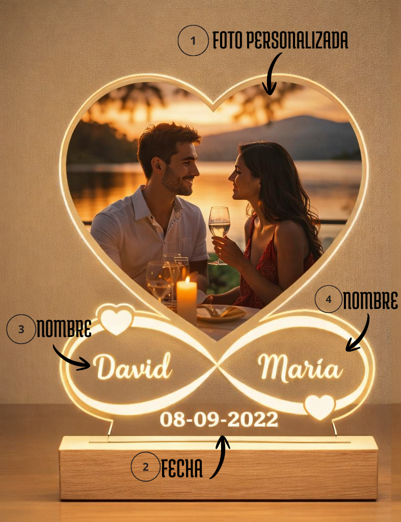 Personalizado con nombres y fecha especial, integrados en un delicado símbolo de infinito, convierte cualquier fotografía en una pieza decorativa única. Su iluminación LED realza la imagen creando un efecto envolvente, perfecto para dormitorios, salones o espacios especiales.